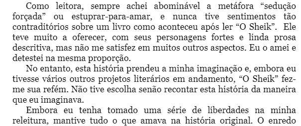 A opinião dela tem muito sentido. É um livro que faz mesmo apologia à violência e ao estupro. Mas essa história recontada não vou ler não, já bastou este original. Me deu curiosidade de ver o filme, nunca vi na da com Rodolfo Valentino, talvez eu procure pra ver.